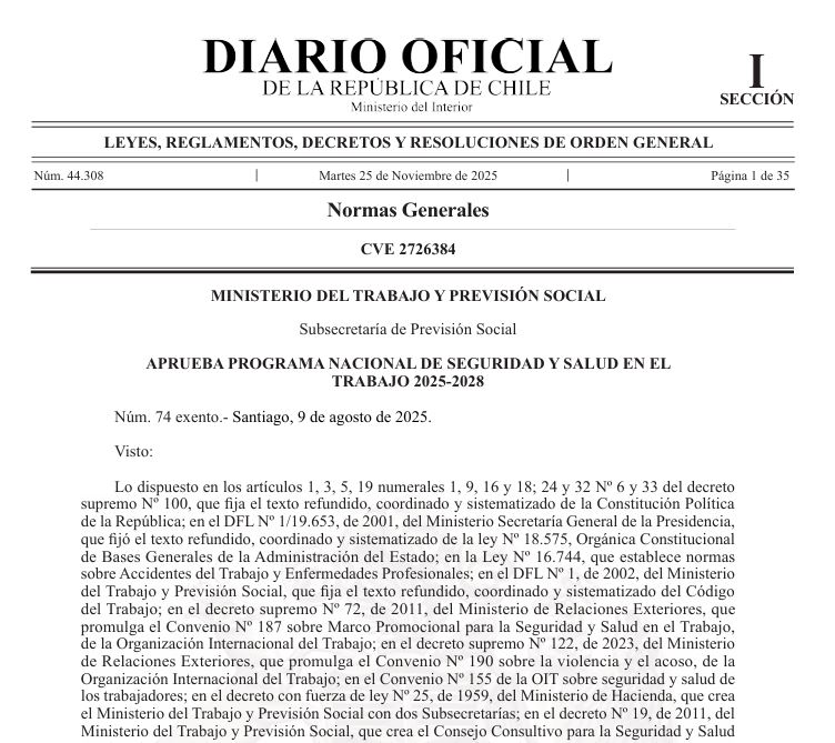 El día de hoy 25-11-2025, se publicó en el Diario Oficial el Programa Nacional de Seguridad y Salud en el Trabajo, para los años 2025 a 2028.